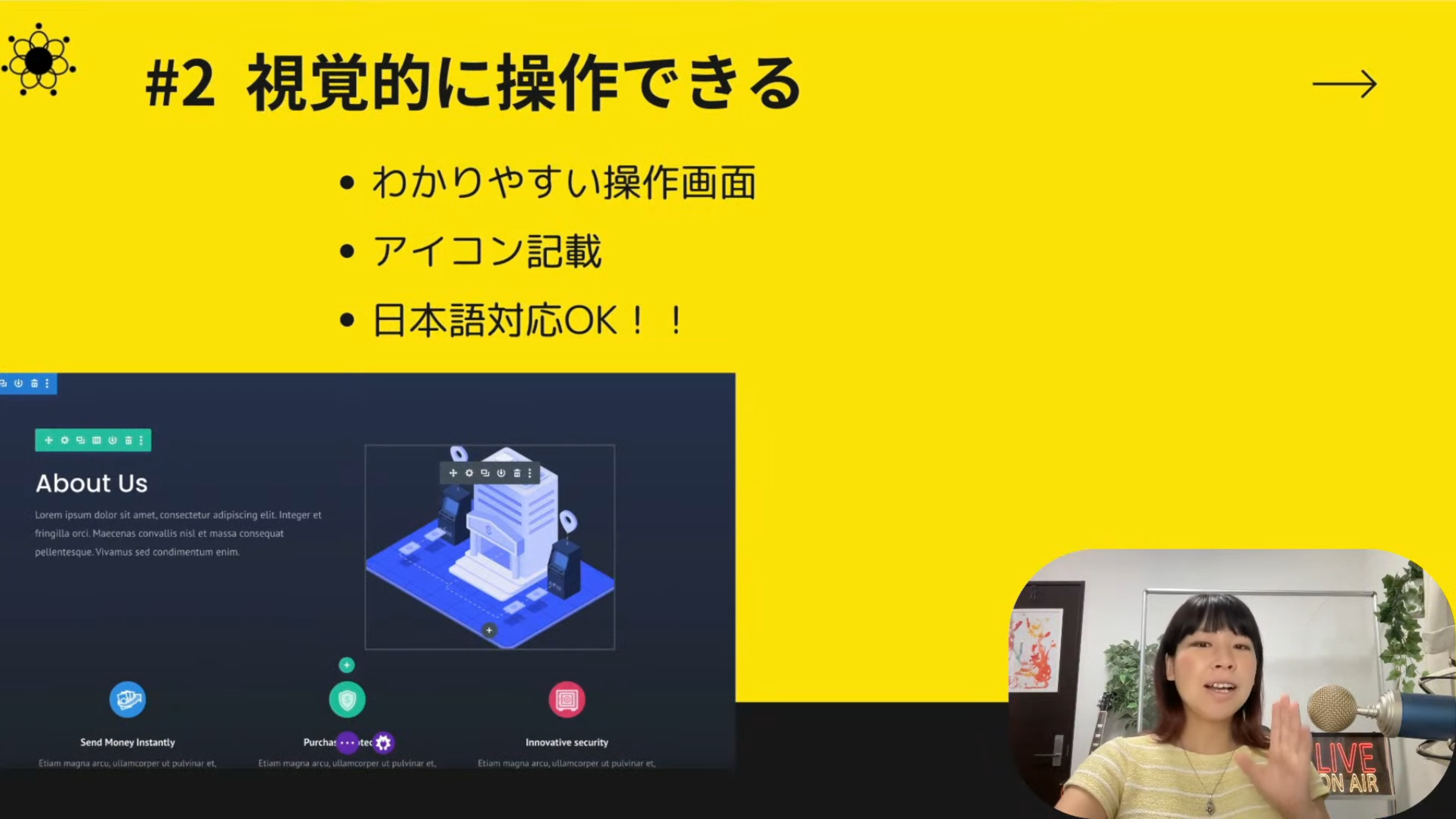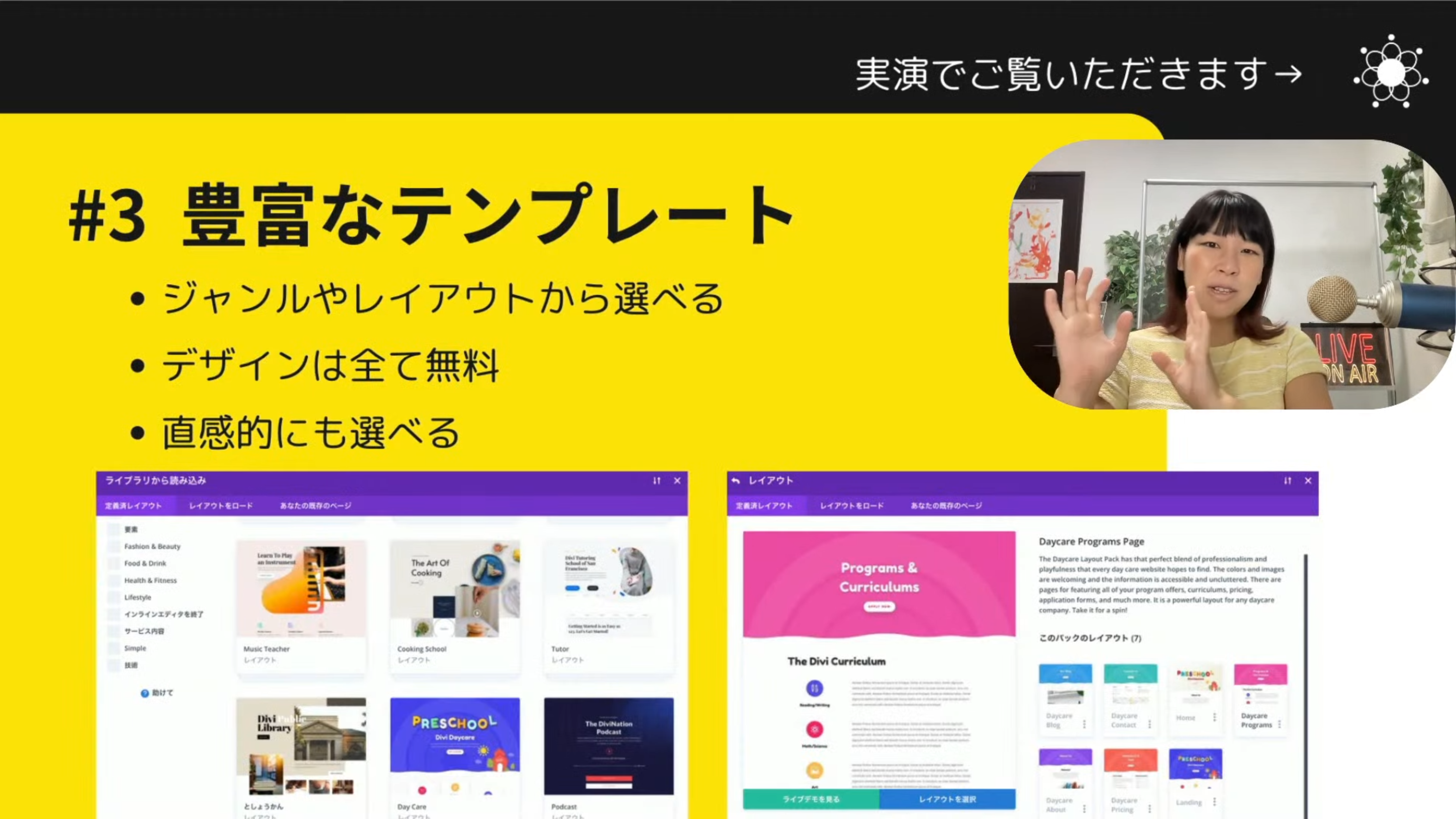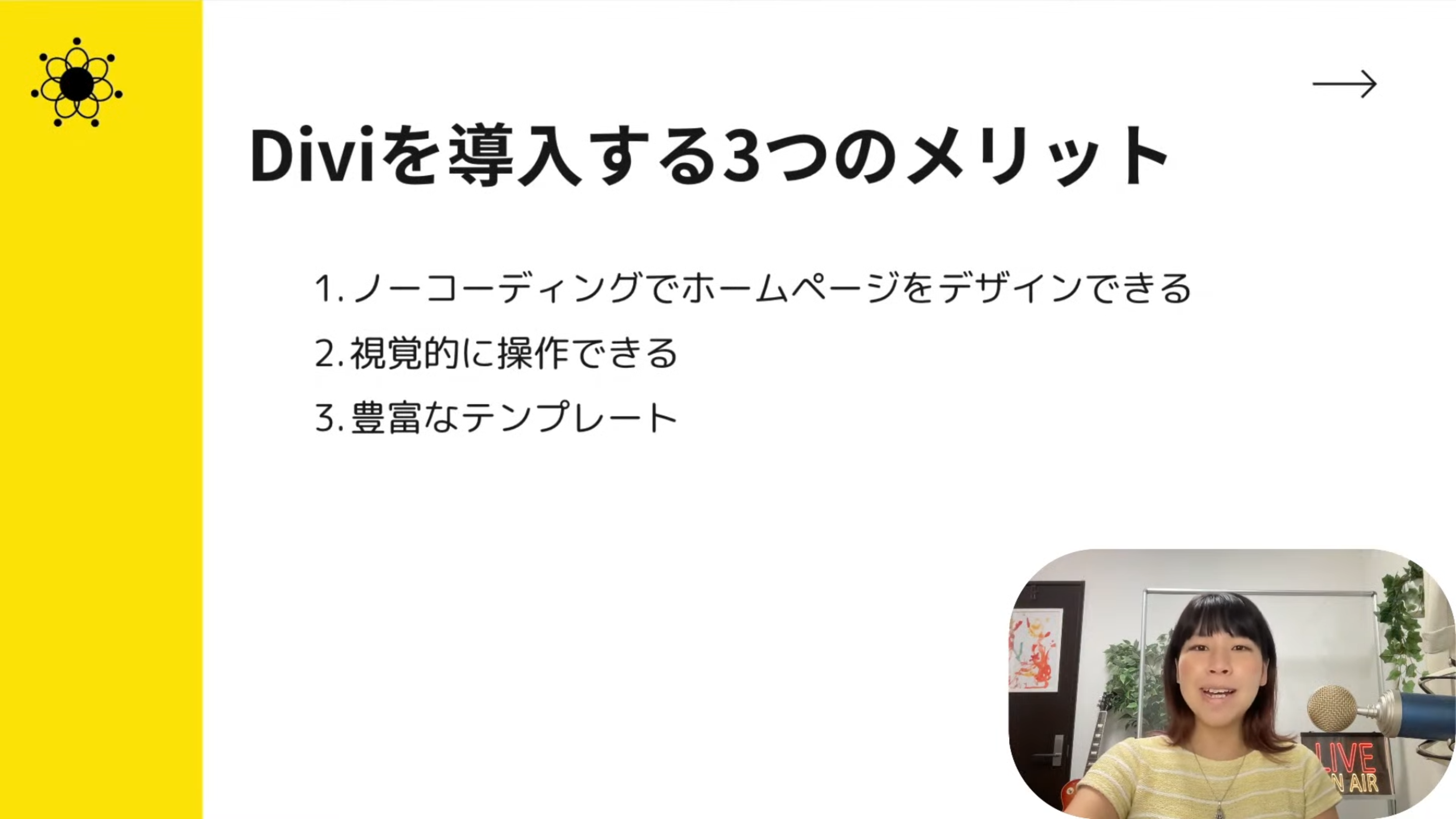 ファーストレッスンでは、Diviを導入する3つのメリットについて解説していきます。それは、Noコーディングでホームページをデザインできること、視覚的に操作できること、豊富なテンプレートがあることです。
